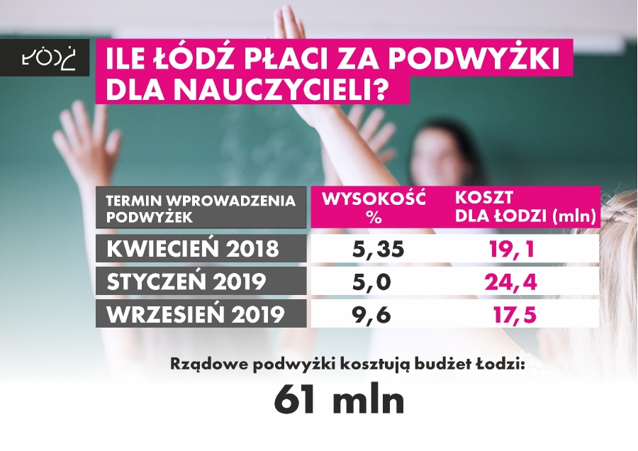 Obiecane przez rząd PiS podwyżki dla nauczycieli, w wysokości nieco ponad 9%, mają wejść w życie od września. Niestety za deklaracją rządu nie idą pieniądze dla samorządów, które będą musiały we własnym zakresie wygospodarować pieniądze na wspomniane podwyżki. Dla Łodzi oznacza to konieczność znalezienia dodatkowych 61 milionów złotych.