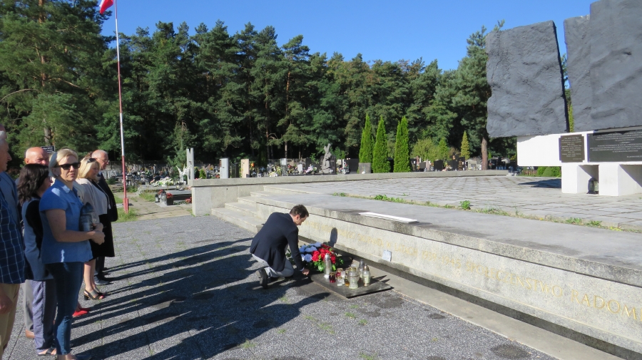 „Na cmentarzu tutejszym spoczywają zwłoki ponad 15 tys. osób, zamordowanych przez oprawców hitlerowskich w latach 1940-1945 w masowych egzekucjach. Wśród pomordowanych znajduje się wielu aktywnych bojowników o wolność i demokrację, jak również wielu więźniów z radomskiego więzienia i mieszkańców getta. Cześć ich pamięci".